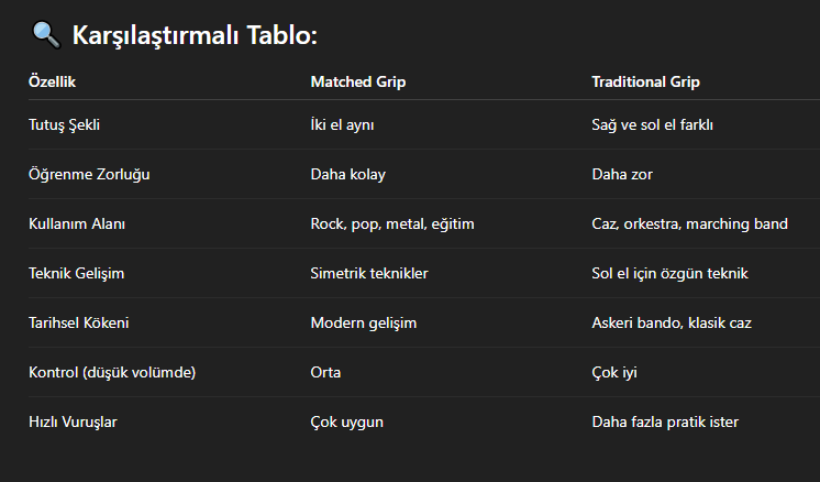 Yeni başlıyorsan ve modern türler (rock, pop, funk vs.) çalmak istiyorsan: Matched grip en uygun tercih.